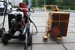 Выполняем заливку трещин на асфальте плавильным котлом-заливщиком